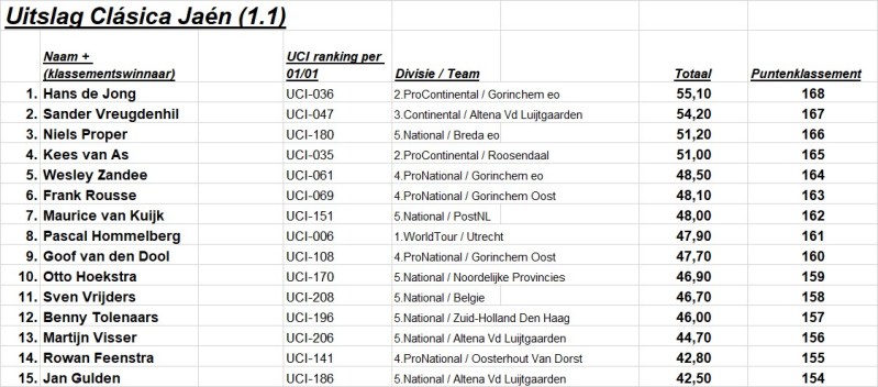 Het klapstuk van de afgelopen week was uiteraard de UAE Tour. Ondanks de vele blessures in de teams van vele deelnemers werden er in de UAE Tour mooie scores behaald. Het oude UAE Tour record (Elly Mathijssen 1117,2 punten in 2025) verdwijnt zelfs uit de boeken omdat winnaar Stefan Verschoor in de editie van 2026 tot een totaal van 1166,5 punten kwam. Ook de nummer 2, Marcel Spijker, overtrof het oude record met zijn 1121,3 punten. De nummer 3, Rolf Pruijsen, lukte dat niet want hij scoorde een totaal van 1022,5 punten.